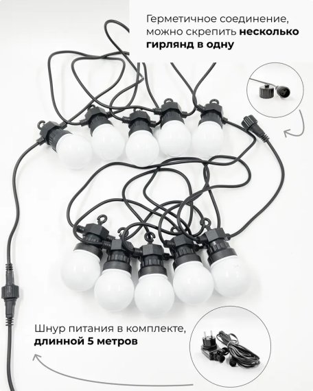 Светодиодная Гирлянда Матовая Колба 5м Тепло-Белая 24В, 10 LED, Провод Черный ПВХ, IP54