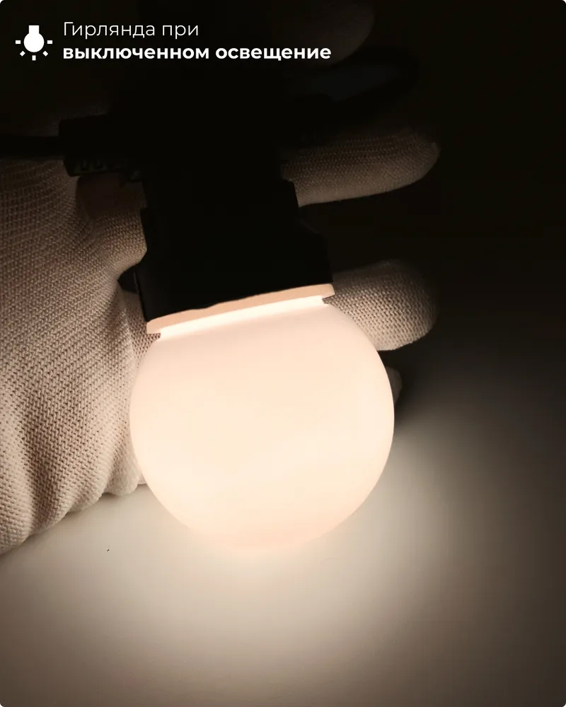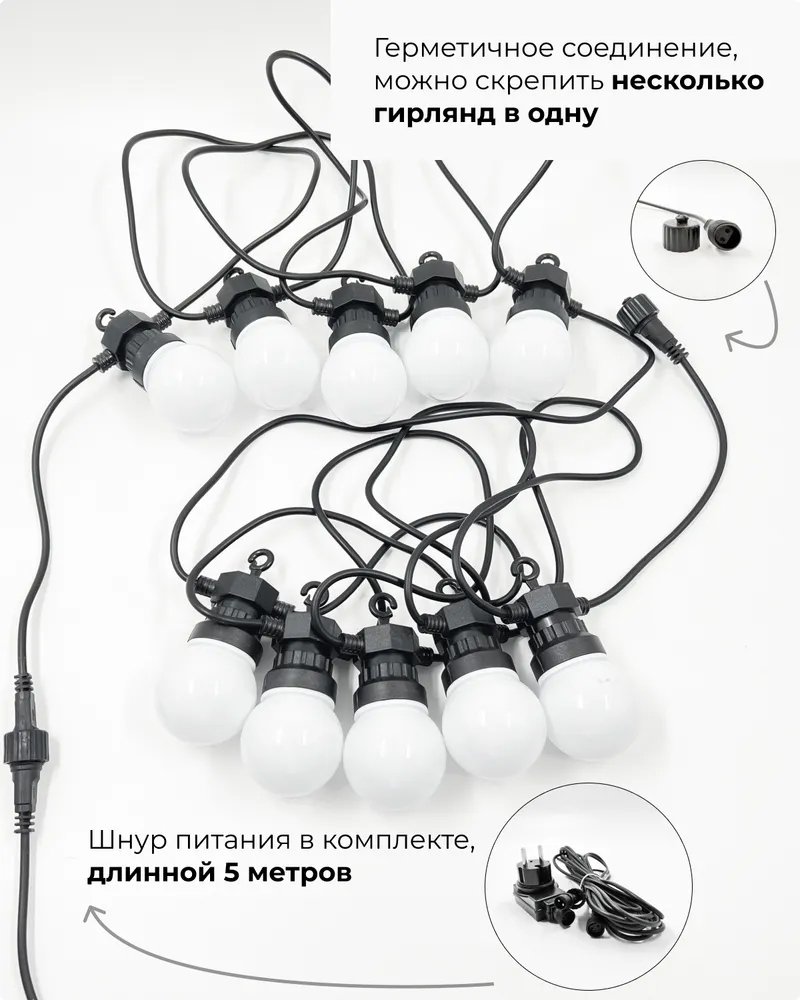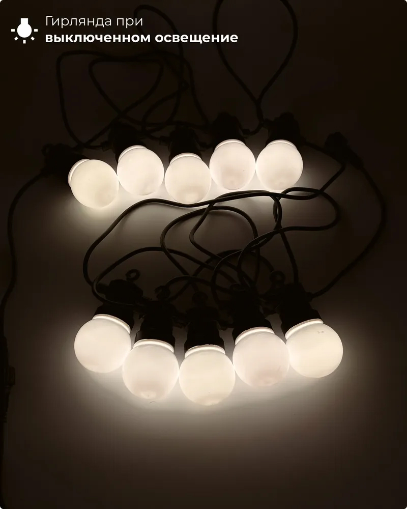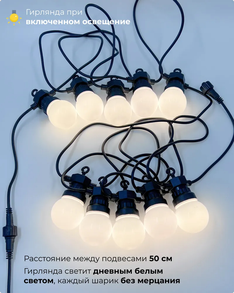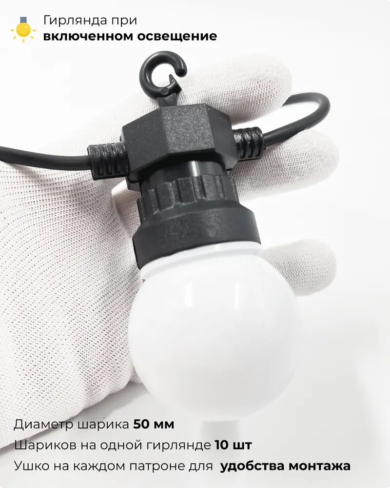 На каждой лампе располагается крючок-крепление для удобного монтажа гирлянды.