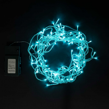 Гирлянда Бахрома ECC100-10-8A от российской фабрики Laitcom. Питание от батарейки D. Лампочки с аква оттенком свечения. Степень защиты от влаги и пыли IP65.