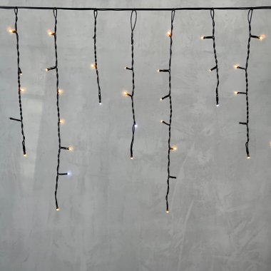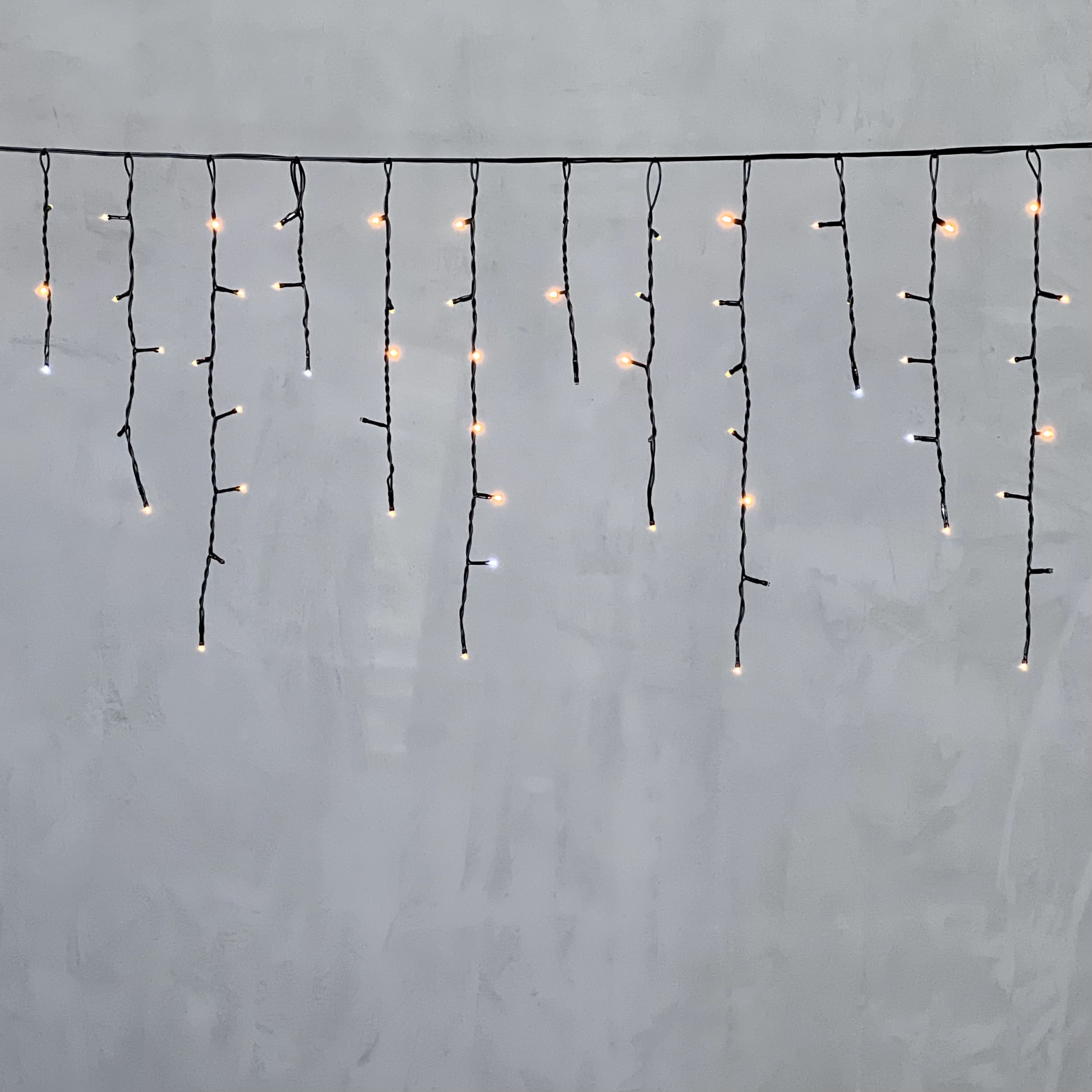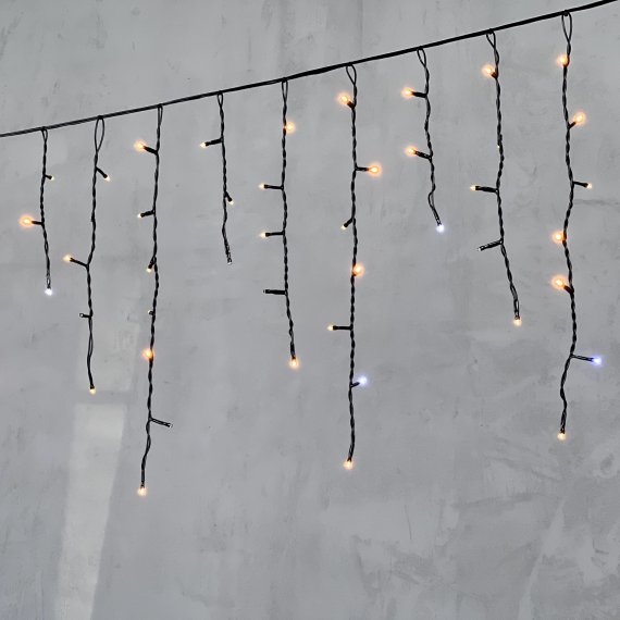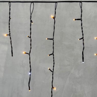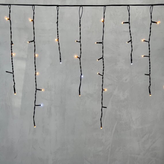 Гирлянда Бахрома PIL150BLW-11-2EWW от российской фабрики Laitcom. Питание от сети 220V. Лампочки с теплым белым оттенком свечения. Степень защиты от влаги и пыли IP54.