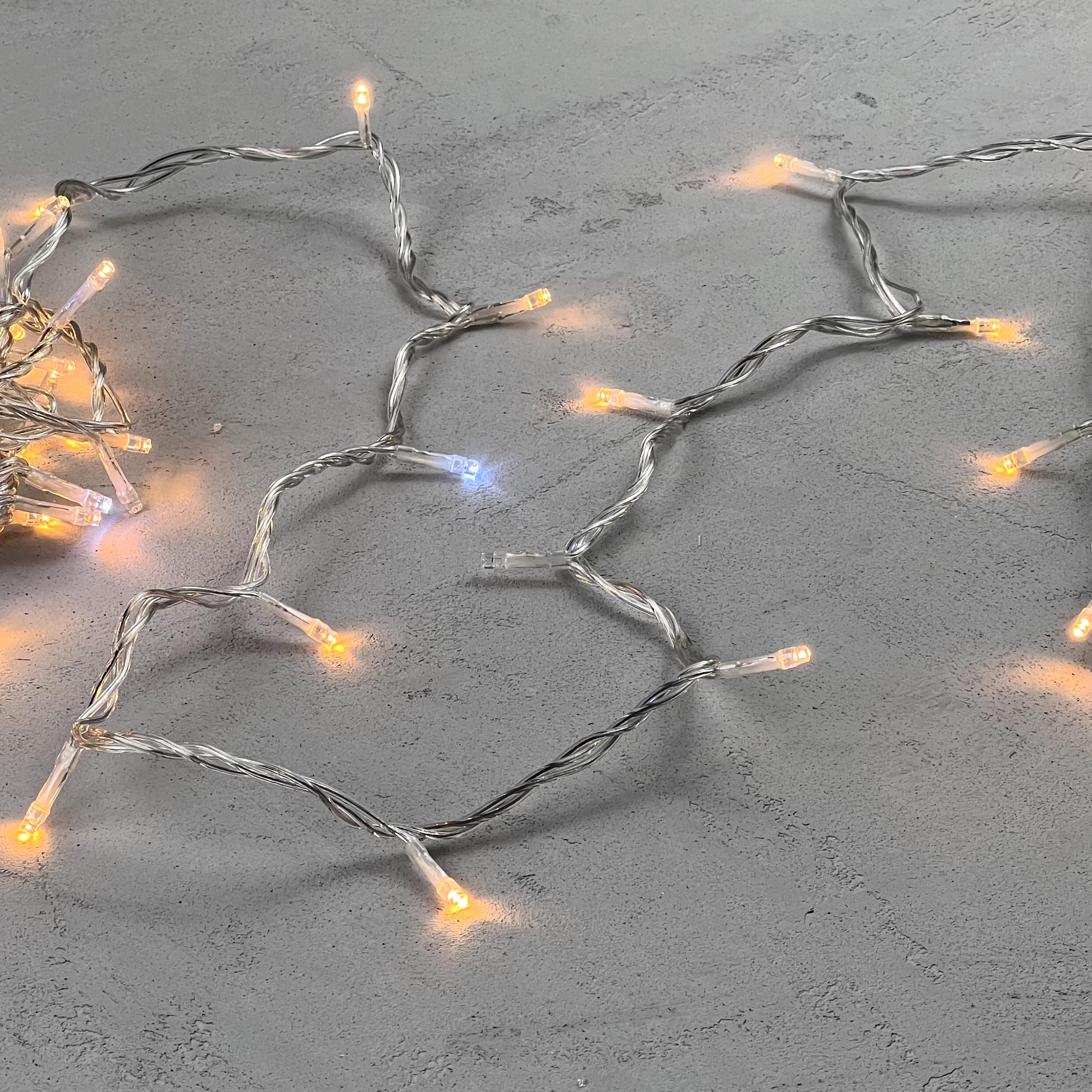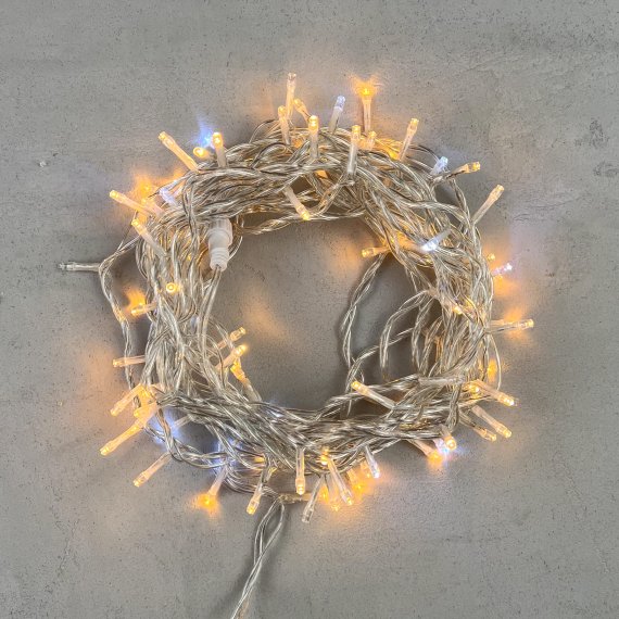 Гирлянда Нить 10м Экстра Тепло-Белая с Мерцанием Белого Диода 24В, 100 LED, Провод Прозрачный ПВХ, IP54